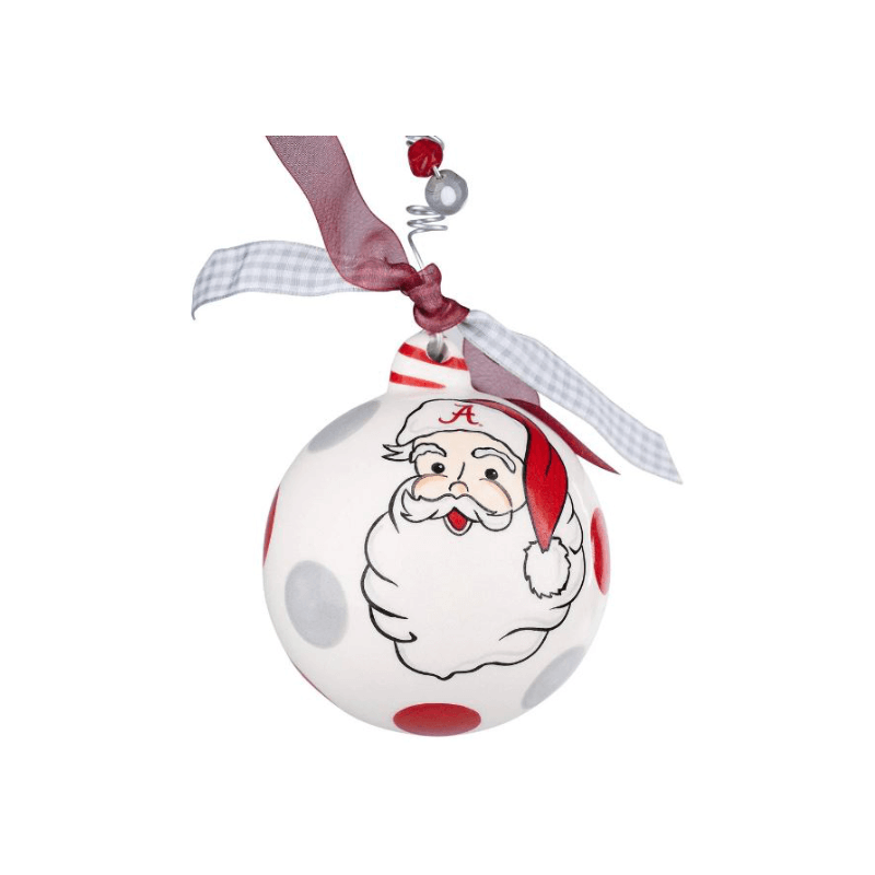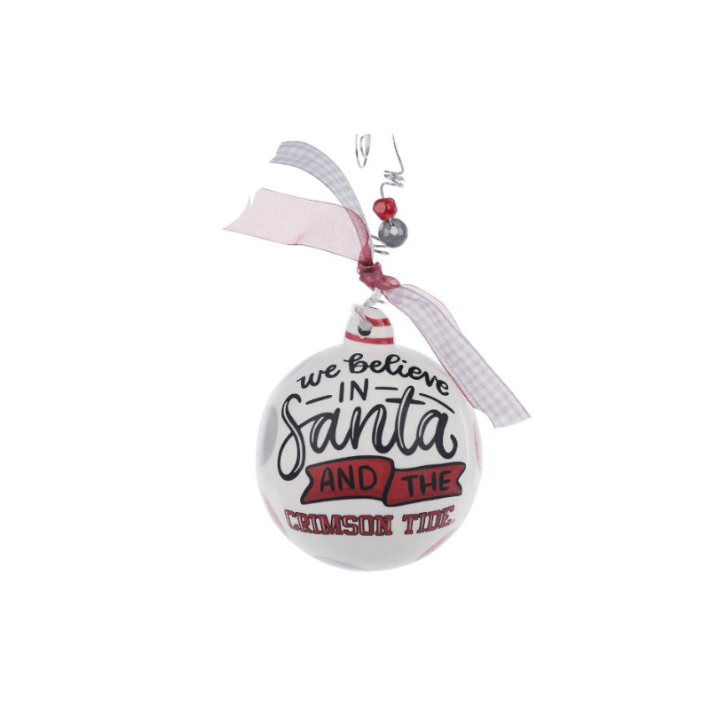 Alabama We Believe Ball Ornament is perfect to hang on your Christmas Tree if you "Believe in Santa and the Crimson Tide!" This ceramic ornament is hand-crafted with care to show your loyalty to Bama! Makes a great gift for Christmas, graduation, and more! Comes with included ribbon.