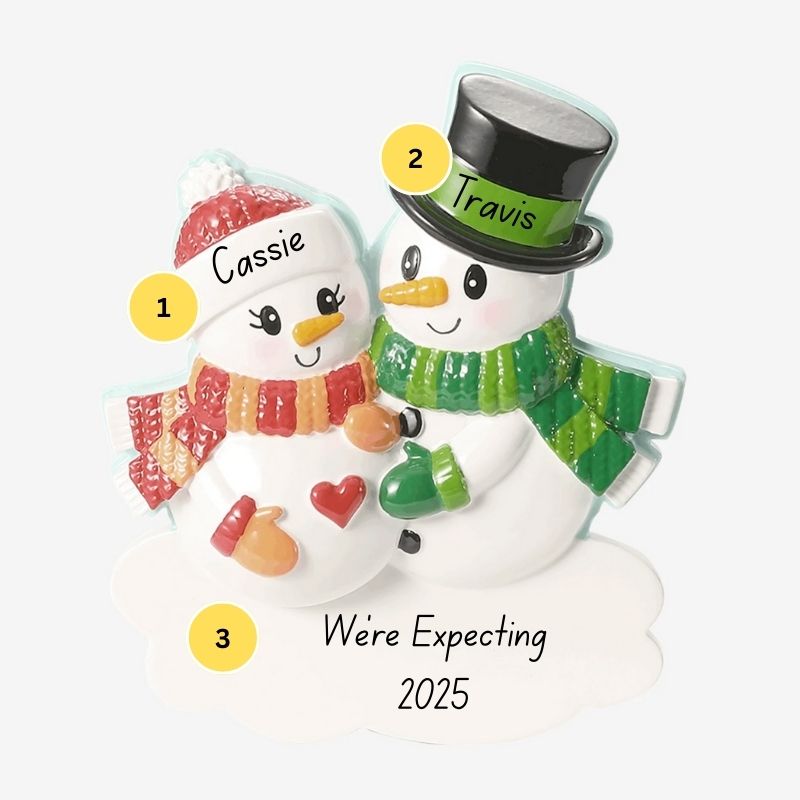 This heartwarming personalized Christmas ornament features an adorable snowman and snowwoman standing side by side, lovingly cradling a tiny snowbaby bump. It's the perfect way to mark the exciting journey to parenthood and makes a thoughtful, festive gift for any expecting couple.