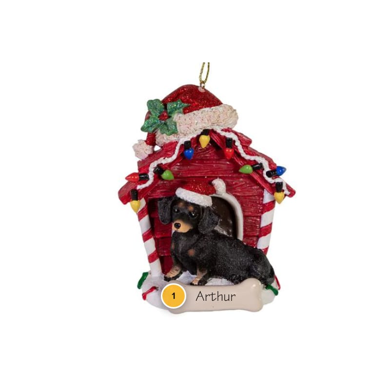 Black Dachshund With Dog House Personalized Ornament is proof that great things comer in small packages this holiday season! Celebrate the joy and companionship of your dachshund with this heartwarming personalized ornament. The ornament can be personalized with the your dog's name, adding a special touch that makes it truly one-of-a-kind. Whether displayed on a Christmas tree or as part of your year-round décor, this ornament is sure to bring a smile to your face and warm your heart. Makes a wonderful gift or treasured keepsake. Ornament comes complete with hanging ribbon.