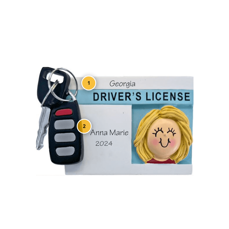 Blonde Female with License Personalized Ornament is the perfect way to show your support and excitement for your child's new milestone. It's also a great gift for other newly licensed drivers, or for anyone who loves cars and driving! Comes complete with hanging ribbon.