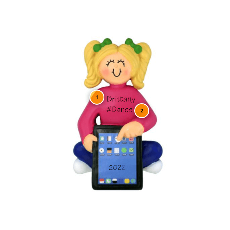 Blonde Girl with Tablet Personalized Ornament is a fun way to commemorate a favorite pastime! Customize with name and year for a special keepsake! Comes complete with hanging ribbon.