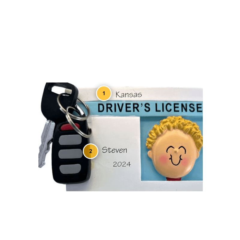 Blonde Male with License Personalized Ornament is the perfect way to show your support and excitement for your child's new milestone. It's also a great gift for other newly licensed drivers, or for anyone who loves cars and driving! Comes complete with hanging ribbon.