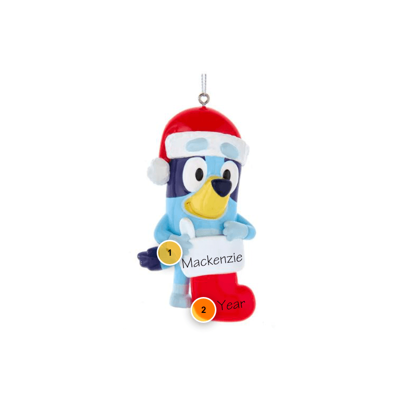 Bluey™ Personalized Ornament is the perfect way to add fun to your tree this Christmas! Ornament features Bluey wearing a red Santa hat with a stocking for personalization. It makes the perfect gift for any Bluey™ fan and makes a great keepsake!