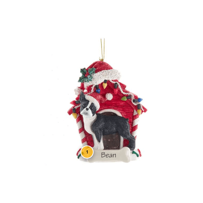 Boston Terrier With Dog House Personalized Ornament is proof that it's the little things that matter most! Celebrate puppy's first Christmas or commemorate your furry family member with free personalization. Makes a wonderful gift or treasured keepsake. Ornament comes complete with hanging ribbon.