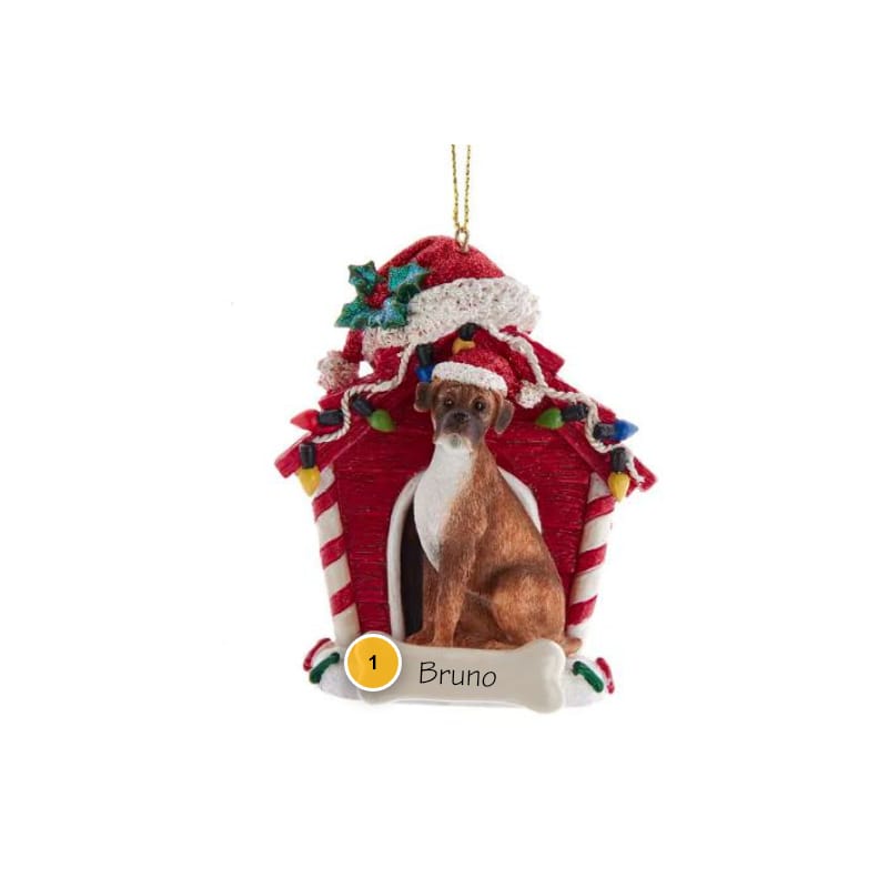 Boxer With Dog House Personalized Ornament is a great way to celebrate a loyal, playful pup this Christmas! Personalization is free, and a wonderful way to celebrate your furry friend or give as a fun gift! Ornament includes hanging ribbon.