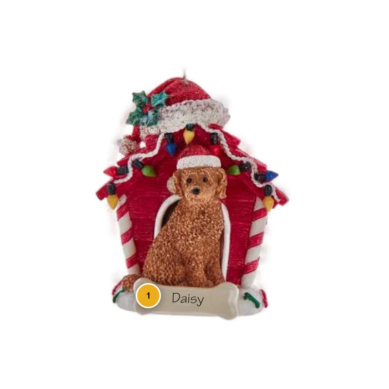 Brown Labradoodle With Dog House Personalized Ornament is ready to tackle Christmas! Fall in love with this special keepsake ornament to celebrate your furry family friend! Personalization is free, and a wonderful way to celebrate your furry friend or give as a fun gift! Ornament includes hanging ribbon.