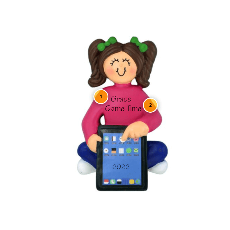 Brunette Girl with Tablet Personalized Ornament is a fun way to commemorate a favorite pastime! Customize with name and year for a special keepsake! Comes complete with hanging ribbon.
