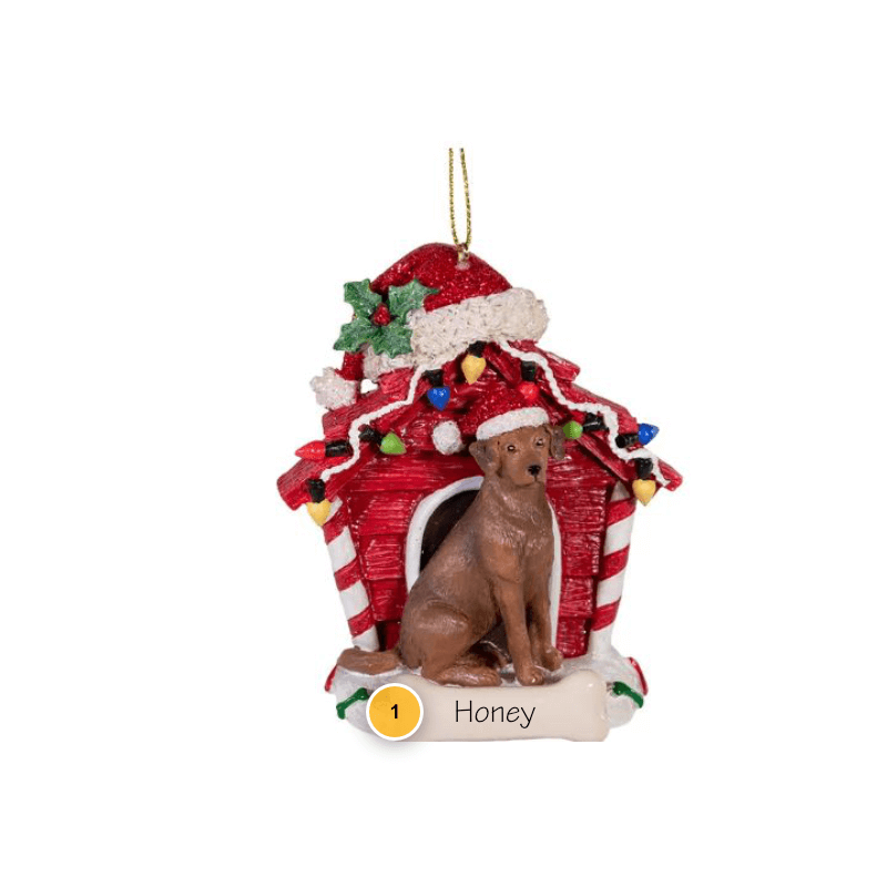 Chocolate Labrador Retriever With Dog House Personalized Ornament is the best way to show off your best bud this Christmas season. Customize this adorable Chocolate Labrador dog ornament with your dog's name, or get one as a gift. Our personalized text is included for no extra charge, so don't miss out on this great deal! Comes complete with a hanging ribbon.
