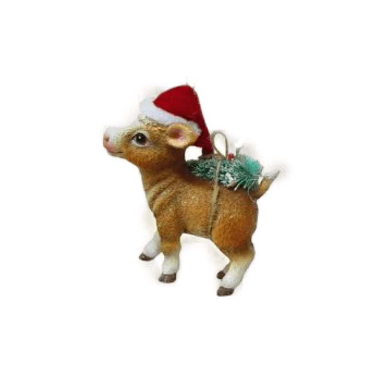 Moo-ve over, reindeer! This adorable cow is ready to spread holiday cheer. Dressed in a festive Santa hat, this charming ornament is perfect for adding a touch of whimsy and fun to your Christmas tree. Whether you're a farm animal lover or simply looking for a unique and memorable decoration, Cow with Santa Hat Ornament is sure to delight.