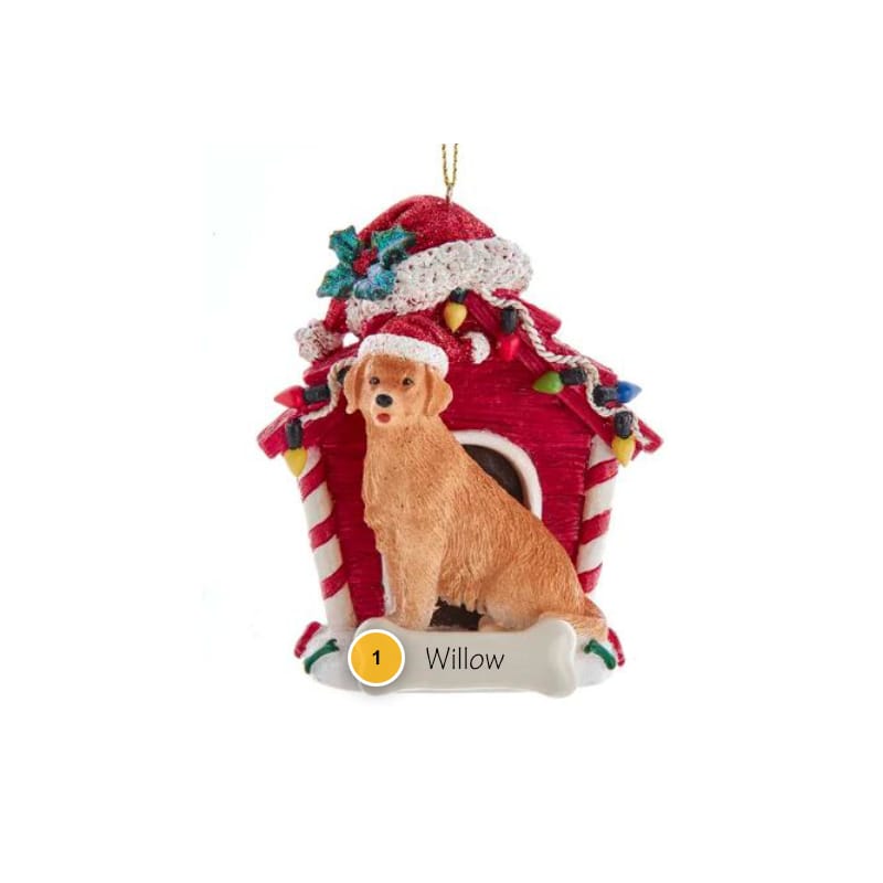 Golden Retriever With Dog House Personalized Ornament is the sweetest way to celebrate a special pup this Christmas! Celebrate the joy and companionship of your Golden Retriever with this heartwarming personalized ornament. The ornament can be personalized with the Golden Retriever's name, adding a special touch that makes it truly one-of-a-kind. Whether displayed on a Christmas tree or as part of your year-round décor, this ornament is sure to bring a smile to your face and warm your heart. Makes a wonderful gift or treasured keepsake. Ornament comes complete with hanging ribbon.