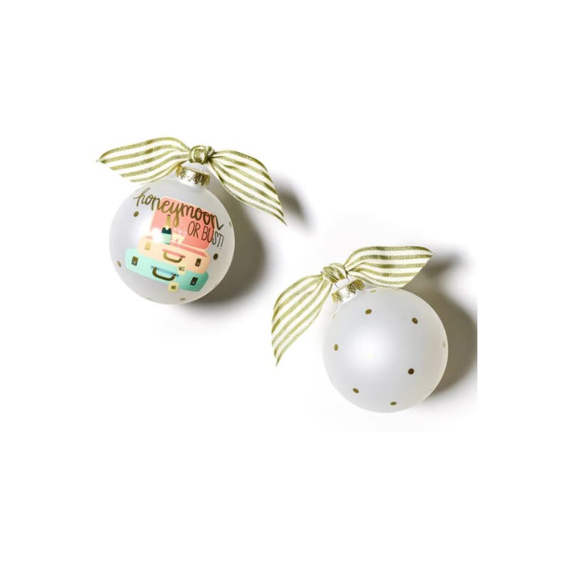 Honeymoon or Bust Ball Ornament is a playful and romantic ornament for newlyweds. Customize it with the couple's names and honeymoon destination to create a unique and fun keepsake. Perfect for celebrating love and adventure.