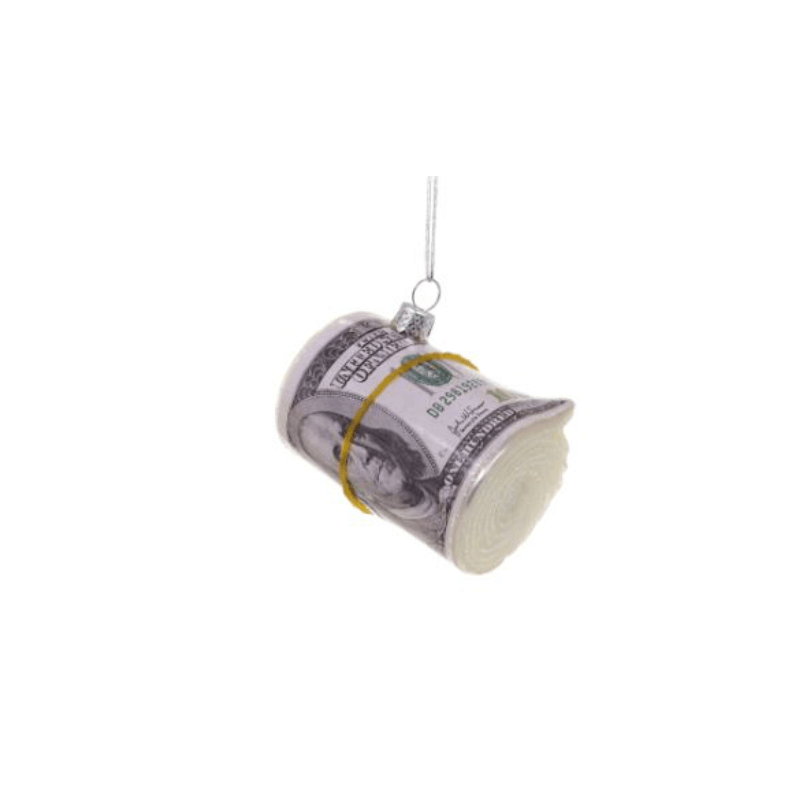 Roll of Cash Glass Ornament shows cash is king this Christmas! This fun ornament is a unique way to wish wealth and happiness this holiday season. A charming and humorous way to celebrate a loved one this holiday season. Ornament comes complete with hanging ribbon.