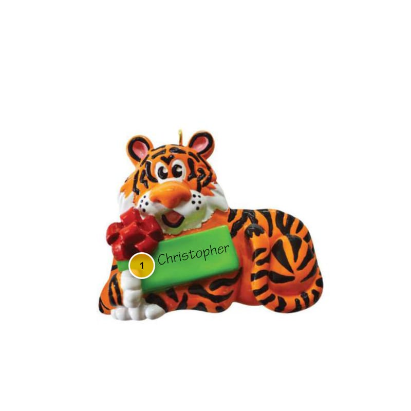 Roar into the holiday season with this personalized tiger ornament. Customize it with a name to create a unique and wild keepsake. This charming ornament is perfect for adding a touch of jungle adventure to your Christmas tree.. We include personalized text for no extra charge, so don't hesitate to order this special memento today! Comes complete with red hanging ribbon.