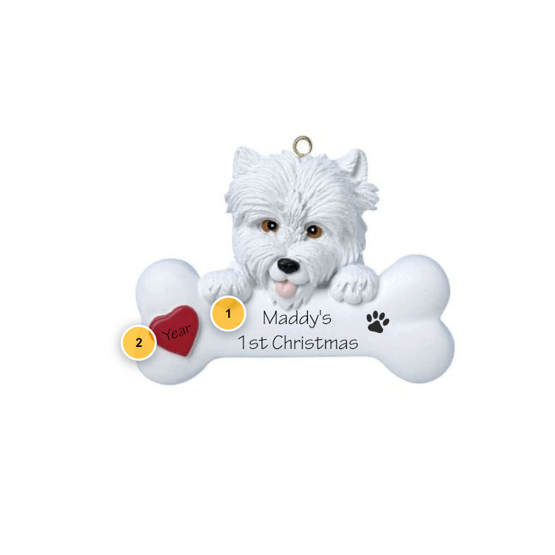 No one makes a bestie like a Westie! Celebrate your bestie with our personalized Westie ornament this Christmas season. Customize this adorable Westie dog ornament with your dog's name, or get one as a gift. Our personalized text is included for no extra charge, so don't miss out on this great deal! Comes complete with a hanging ribbon..