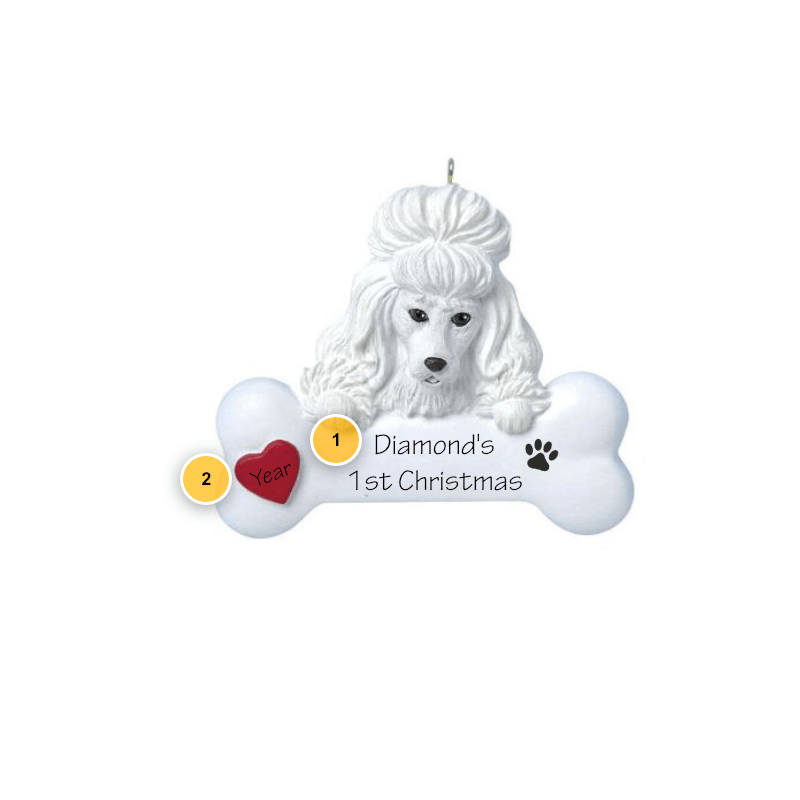 Show off your bestie with our personalized White Poodle ornament this Christmas season. Customize this adorable White Poodle dog ornament with your dog's name, or get one as a gift. Our personalized text is included for no extra charge, so don't miss out on this great deal! Comes complete with a hanging ribbon.