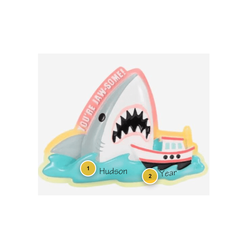 You're Jawsome Personalized Ornament is a great way to celebrate a fin-tastic holiday season! Makes a great gift or treasured keepsake for any shark enthusiast. We include personalized text for no extra charge, so don't hesitate to order this special memento today! Comes complete with ribbon.